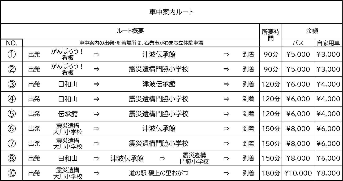 ※門脇小学校案内について…20名を超えた場合はガイド2名とし追加料金2,000円を頂戴いたします。 ※車中案内での普通車は、5名様以内とさせていただきます。但し、未就学児は除く ※予約は基本1ヶ月前までといたします。但し、予約状況を確認の上、受け入れ可能の場合は1週間までは受付可能 ※表の料金は1台あたりの金額となります。