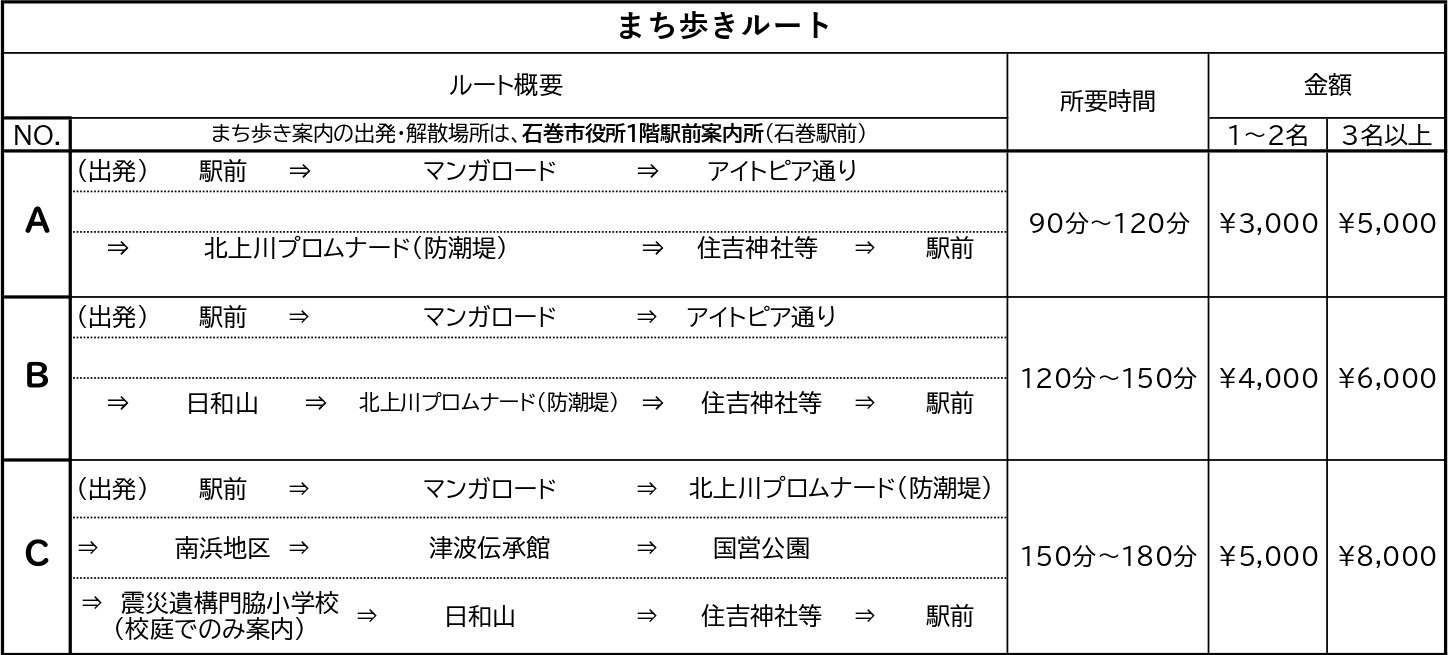 ※天候不順時や歩き時間を短縮したい方へのお勧めとして「街歩きイレギュラー2時間コース」などもあります。  路線バスやTAXI等利用し、主な震災施設をご見学いただくコースです。ご要望に添える行程をご提案しますので、お問い合わせください。 ※お荷物は石巻市役所庁舎1階駅前観光案内所で無料でお預かりしております。(街歩きご予約者のみ) ※7月下旬から9月末頃まで「まち歩き」は実施しておりません。ご相談ください。