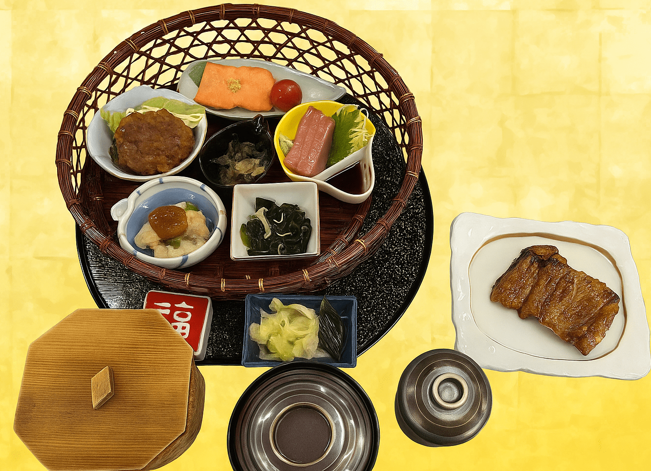 地元の食材を使用した人気のお弁当、ミニ茶碗蒸しと創業以来継ぎ足しのタレで焼く蒲焼のついた金華巳歳御膳です。