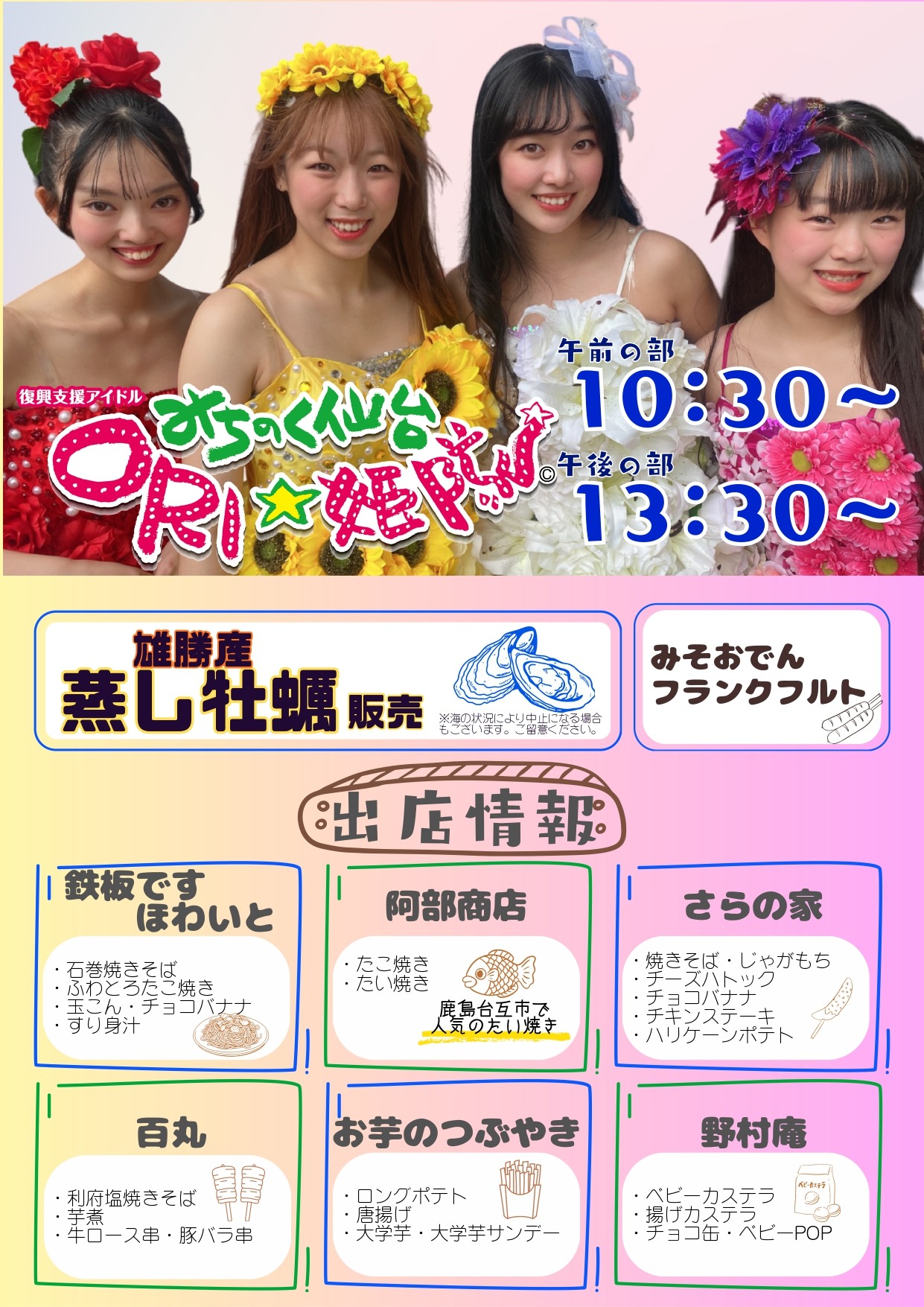 12月21日 Merry Xmas おがつ 🎄 道の駅 硯上の里おがつ 🎄 Merry Xmas おがつ 美味しいグルメとステージでクリスマスを楽しもう! 📅 開催日時・会場 12月21日(日) 10:00 ~ 15:00 会場:道の駅 硯上の里おがつ (宮城県石巻市雄勝町下雄勝2-5) 🎁 イベント内容 🎅 サンタさんからのプレゼントがあるかも♡♡ 🎯 射的コーナー(景品がいっぱい!) 🚚 キッチンカー&各種海鮮焼き 🎤 復興支援アイドル「みちのく仙台ORI☆姫隊」 【午前の部】 10:30 ~ 【午後の部】 13:30 ~ 🍴 出店・グルメ情報 🦪 雄勝産 蒸し牡蠣 販売 ※海の状況により中止になる場合がございます。 その他:みそおでん、フランクフルト 鉄板です ほわいと 石巻焼きそば、ふわとろたこ焼き、玉こん、チョコバナナ、すり身汁 阿部商店 たこ焼き、たい焼き(鹿島台互市で人気!) さらの家 焼きそば、じゃがもち、チーズハトック、チキンステーキ、ハリケーンポテト 百丸 利府塩焼きそば、芋煮、牛ロース串、豚バラ串 お芋のつぶやき ロングポテト、唐揚げ、大学芋、大学芋サンデー 野村庵 ベビーカステラ、揚げカステラ、チョコ缶、ベビーPOP 【主催】 一般社団法人硯上の里おがつ / おがつ復興市実行委員会 【お問い合わせ】 TEL: 0225-25-6844 石巻旬のおすすめ Ishinomaki's best season recommendations 宿泊 ホテルフロンティア 宿泊 旅館いしのまき 宿泊 ホテルパークライト 宿泊 ホテルパシフィック 学ぶ観光スポット MEET門脇 ガイド学ぶ観光スポット みちのくGOLD浪漫 おすすめ情報をもっと見る イベント・コラムEvent 観光スポットSightseeing グルメ・おみやげGourmet&gift 宿泊Stay ガイドGuide 石巻エリアファンクラブ 被災地の今 ふるさと納税 おやつ カフェ スイーツ タクシー ハンバーグ ビジネスホテル ホテル レンタカー 中華料理 割烹 和菓子 学ぶ 寿司 居酒屋 弁当 懐石料理 料亭 旅館 桜 民宿 海上タクシー 海産物 海鮮 田代島 神社 網地島 蒲鉾 見る 買う 道の駅 金華丼 金華寿司 金華山 釜めし 銘菓 食べる 食事処 食堂 鯨歯工芸品